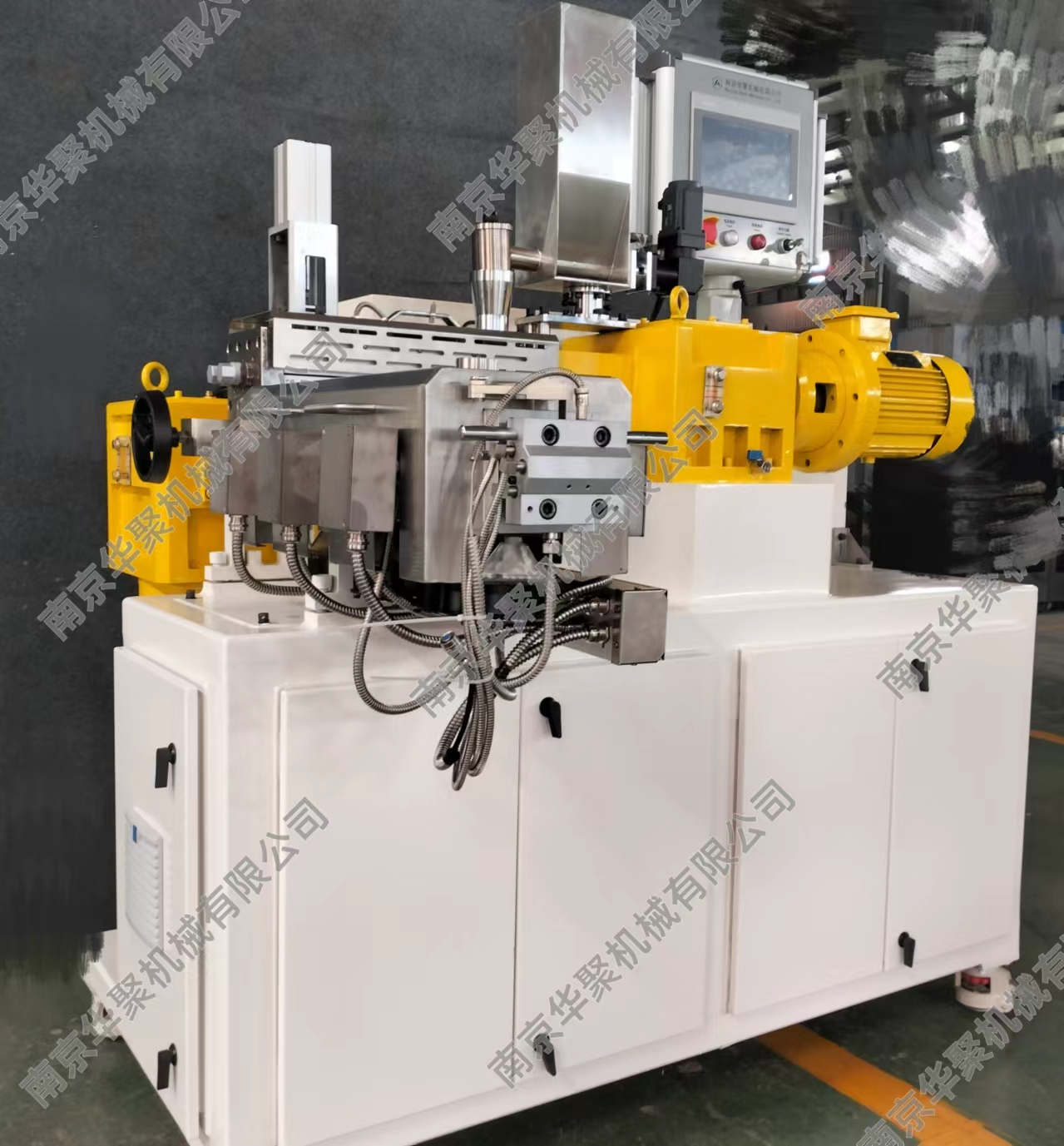 1、占地面積小,主機長寬高為1600X1350X1650mm,帶有移動腳輪。 2、集成連續密煉與雙螺桿的優勢特點,連續式擠出,方便各種研發測試使用。 3、能耗低,裝機裝機功率22KW,實際操作功耗更低,類似一臺中央空調功率。 4、產量范圍1-10Kg/h,方便少量物料測試,伺服電機喂料驅動更穩定精確。 5、一體化設計,電控冷卻系統全部集成,無需額外安裝,接電即用。 6、連續密煉機可翻轉腔體和雙螺桿快開機頭設計,方便清理及檢查維護。 7、全系統安全連鎖,觸摸屏操作,多處安全停機保護,使用更放心。 8、整機1噸,方便裝卸。